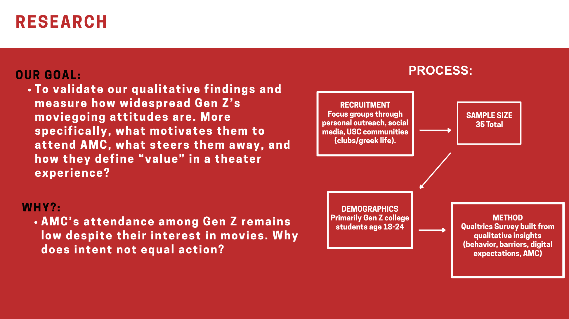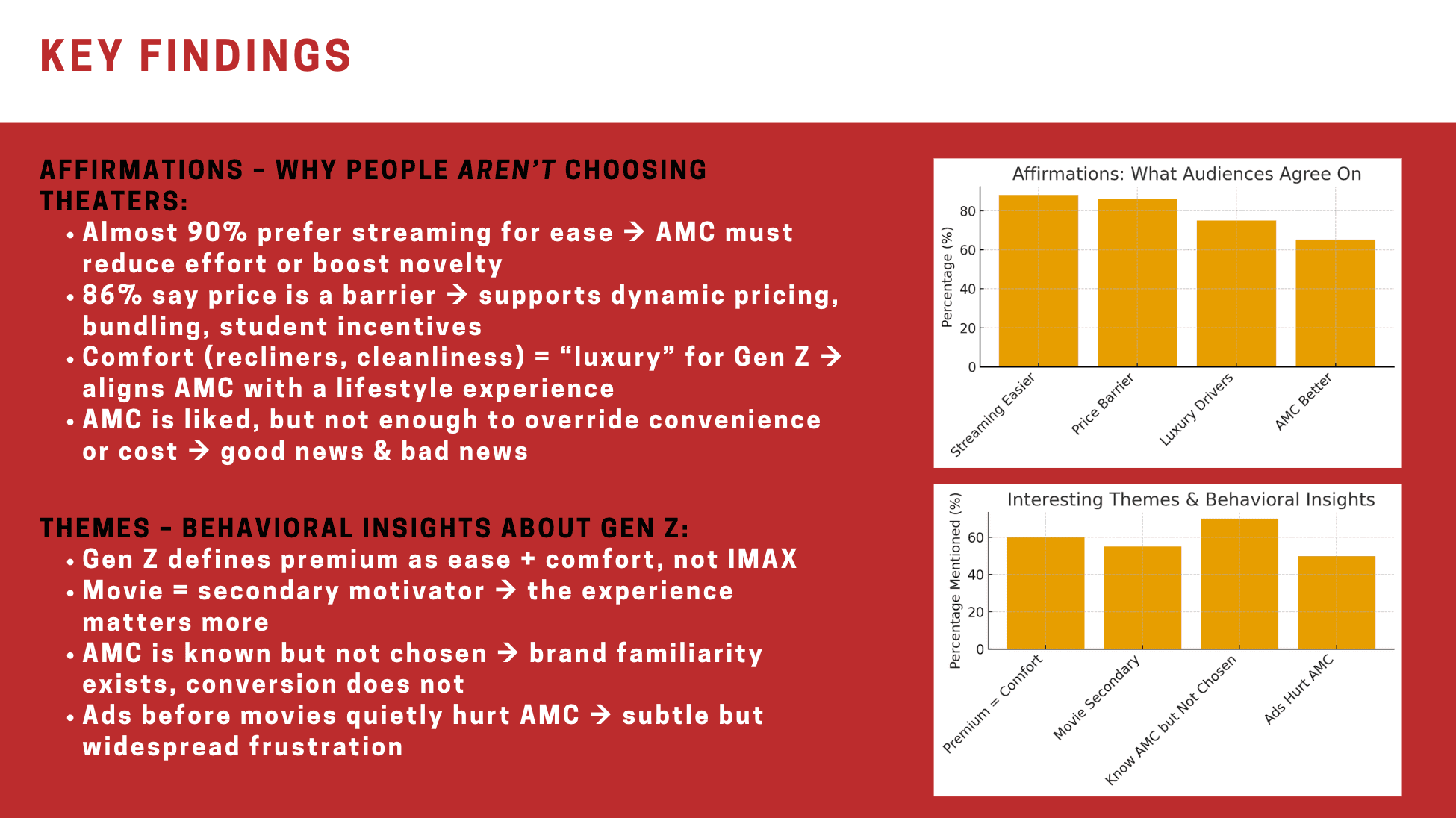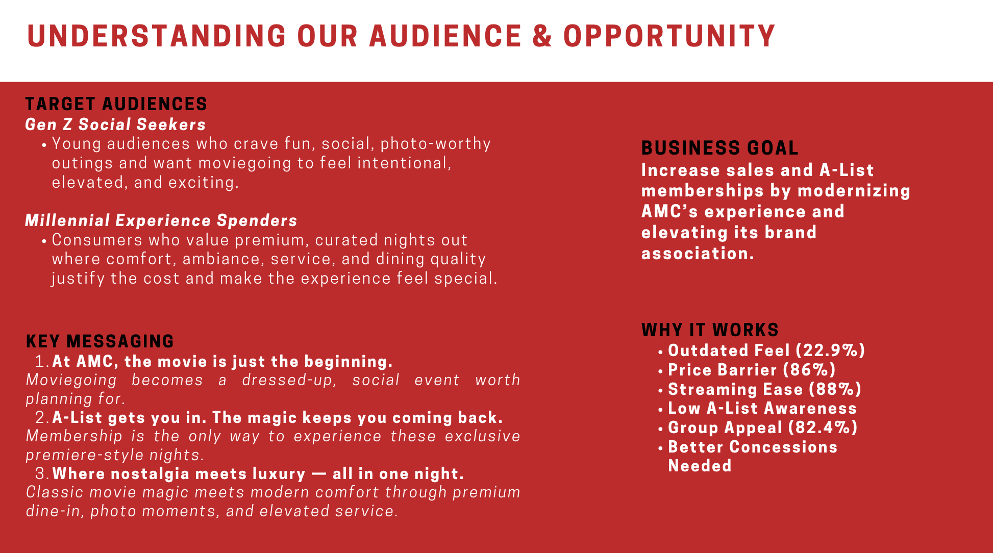 Identify barriers in AMC sales through research and primary focus group insights, then develop a tailored strategy and creative brief. Led multiple aspects of the project, including visual direction, focus group management, and the creative brief.